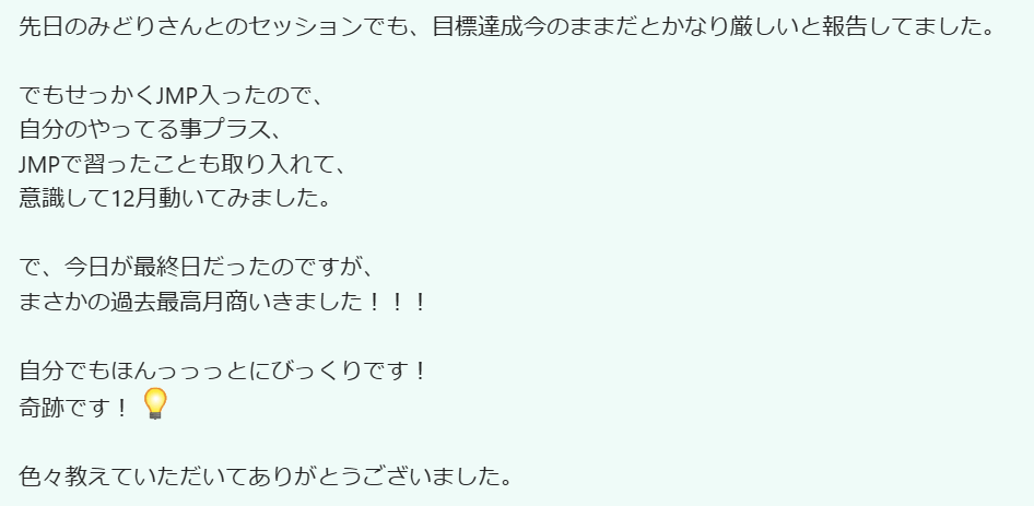 先日のみどりさんとのセッションでも、目標達成今のままだとかなり厳しいと報告してました。